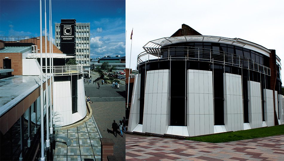 First, Glasgow Caledonian University announced its status with an eye-catching logo emblazoned high on its nondescript blocks, signalling the name over the motorway and the city. The effect could have been awful.