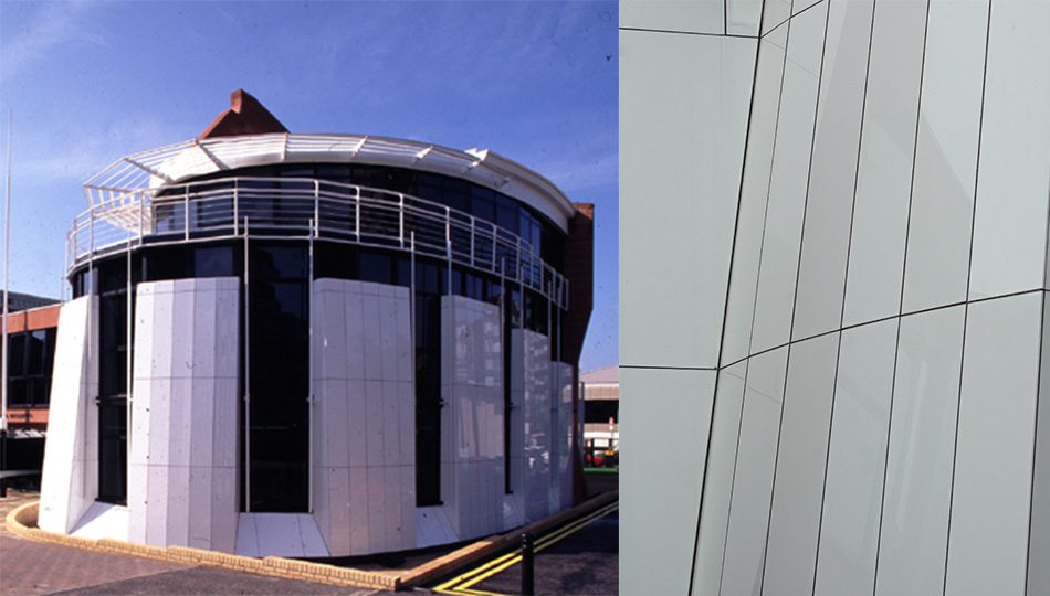 The north elevation is faced with white Neoparies panels; essentially molten glass manufactured in Japan. Due to a constantly changing plan radius and elevational rake, every panel was slightly different in size. This was the first time the product was used in the UK.