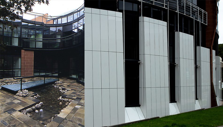 The curved and raking Neoparies cladding which faces the inner campus and the glazed courtyard elevations were probably our first experience of setting out in 3D. Very high standards were required to suit the off-site fabrication of these panels and curtain walling. No BIM models in those days!