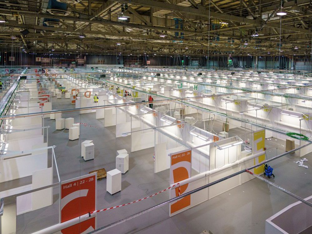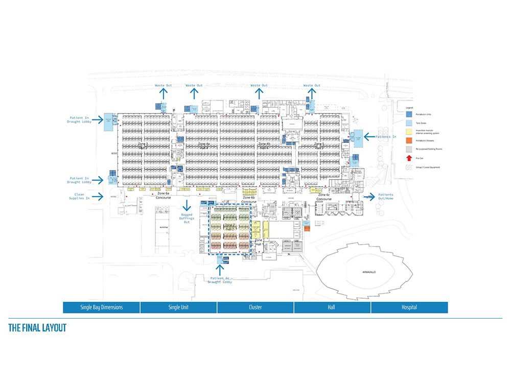 The resultant hospital – known as the NHS Louisa Jordan Hospital – is a step-down facility for patients recovering from COVID-19. The priority of 300 beds were made available by mid-April 2020, with a further requirement to provide a total of over 1,000 beds thereafter. The hospital facilities have been planned within the existing Scottish Event Campus buildings in Glasgow. Keppie’s in-depth knowledge of the existing SEC buildings from our ongoing project to extend and revitalise the facility was invaluable. It allowed us to develop a core concept for the hospital within hours of arriving on the project. That underlying concept remained the one that the whole project was based on.