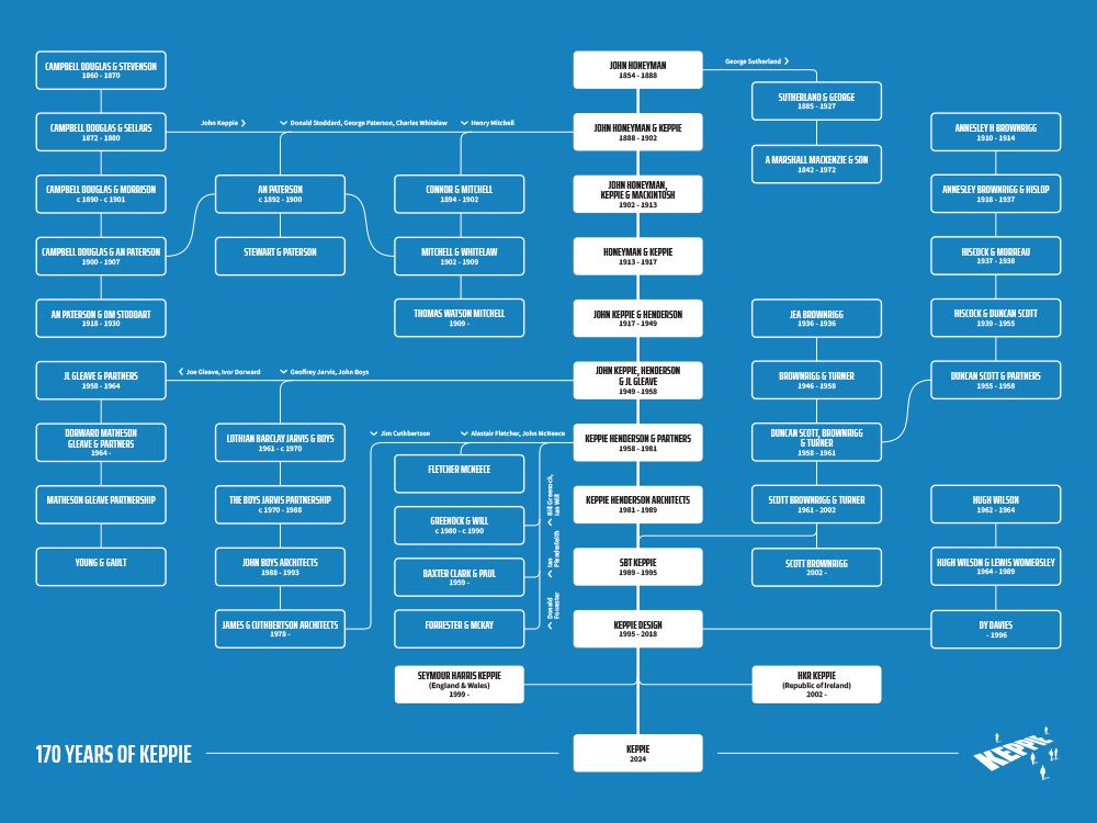 2024 is an extremely significant year for Keppie. 170 years ago, John Honeyman returned to Glasgow from London to set up a small architectural studio of his own. He was 23 years old. From this seed, his firm developed and grew into one of Scotland’s largest ever design practices; one which still bears the name of Honeyman’s first partner, John Keppie. In 2017, the current iteration of Keppie began, led by four like-minded individuals who share the same passion, ethos, and ambitions for the practice:
