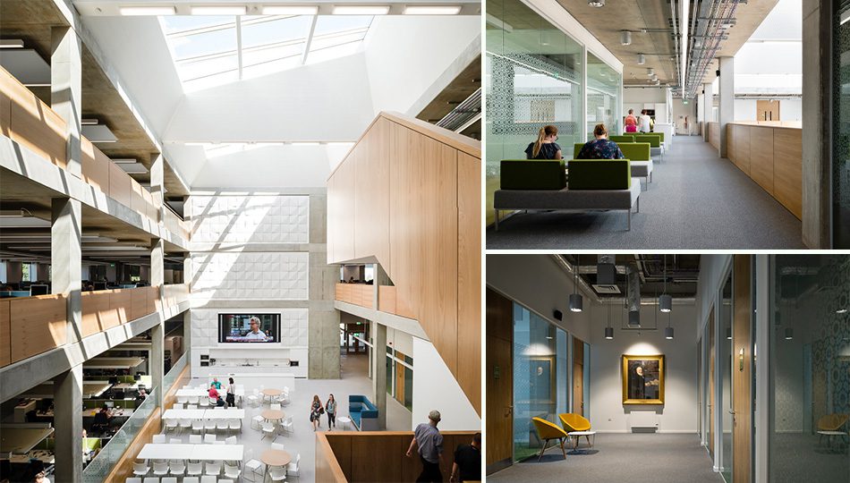 Beyond this, 3 floors of simple office floor plates are organised around a central atrium space which forms the social heart of the building. The space is used as informal workspace, for casual meetings, staff presentations and lunch, while supporting the naturally lit and ventilated building strategies.