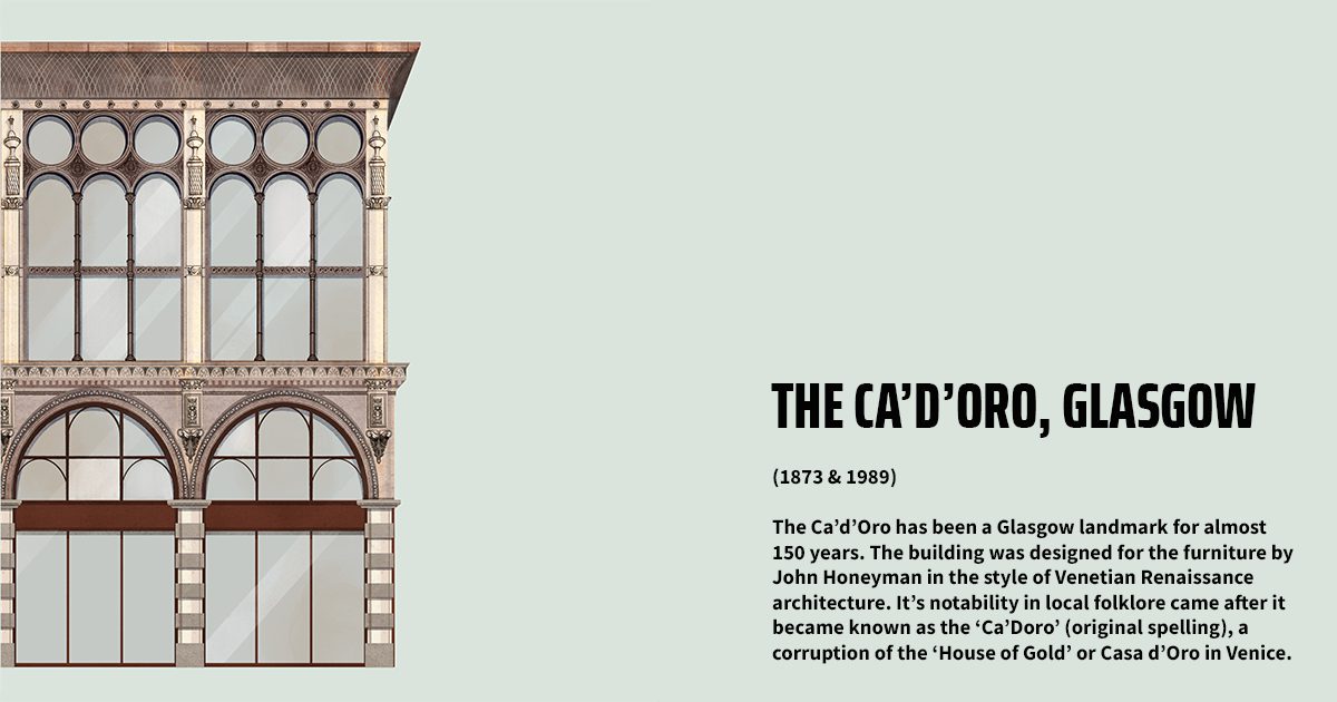 The building was constructed at a cost of £11,000; a figure that would equate to a relatively modest £1.5m in 2024. The Ca’d’Oro’s use as a furniture store ceased in 1896, when it housed Mrs McCall’s Victorian Restaurant. In 1921, it became the flagship of the City Bakeries.
