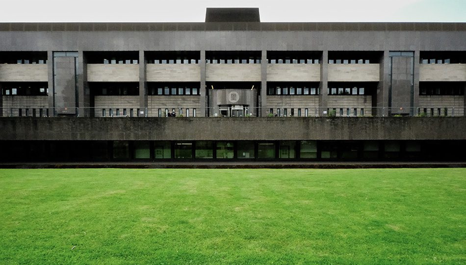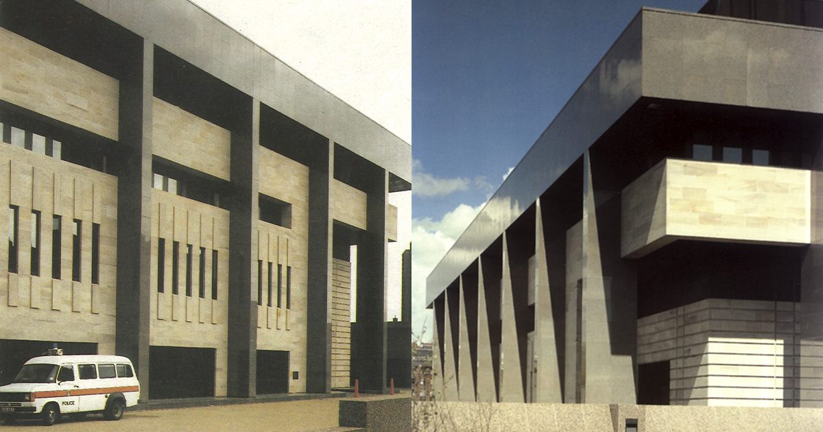 As indicated initially, law courts are normally part of a conscious urban development, but there is little sign of this here. The urban context, manifestly beyond the control of the architects, has all the glamour of that of a peripheral hypermarket. Despite the boldly modelled boundary walls and ancillary building with its emphatic granite face bearing the incised building title the general surroundings bear all the hallmarks of a ‘security scape’.