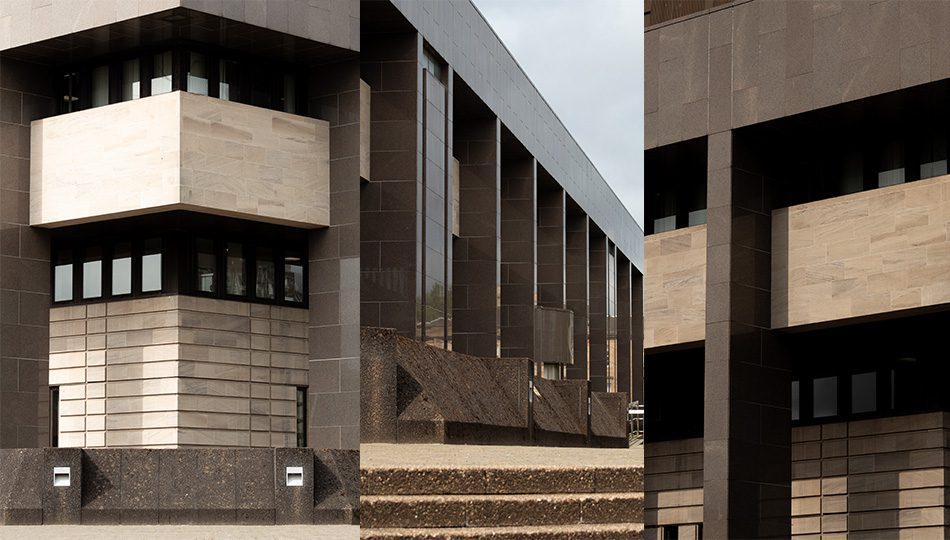 However, the outcome of all this design for security was to focus the eye on the structure as an isolated monumental statement. The importance of the view across the Clyde has been recognised and presumably the strong scale and symmetry are a response to this. The powerful structural framework features a huge capping beam/cornice supported by deep columns. This is faced with a dark greyish/pink granite from the Moselokke quarry on the Danish island of Bornholm. Set within this and given the same uninterrupted horizontal emphasis is a subsidiary apparent structure, faced with pale sandstone, and having greater cantilever beams at the corners. The river face is set back yet again with two floors having strongly emphasised coursing.