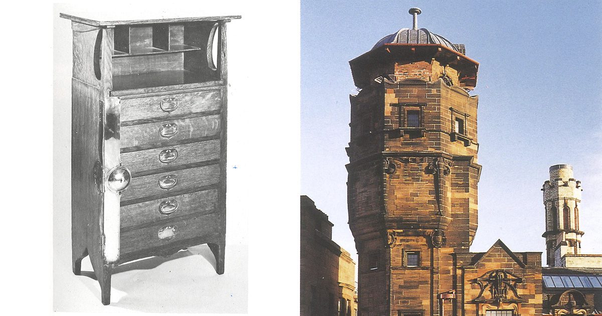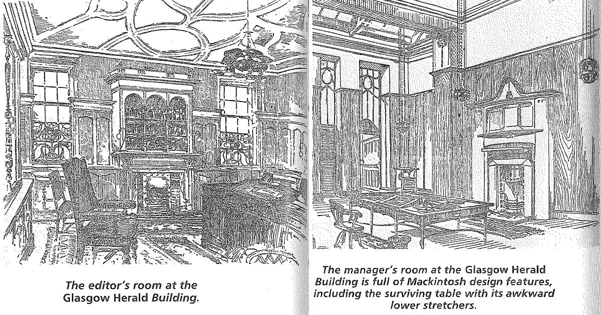 As well as the upper parts of the Mitchell Street building, including the water tower, Mackintosh participated in the interior design of the of the part of the building between it and the Buchanan Street section. The design of the editor’s room (1894) is probably by Keppie, but there are some details suggestive of Mackintosh’s influence.
