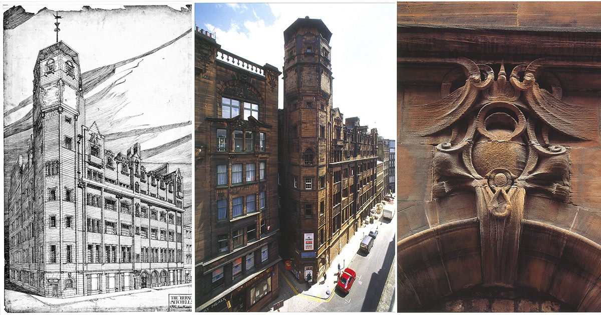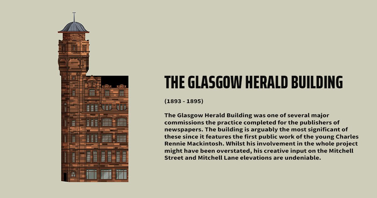 The practice was commissioned to carry out alterations to the Buchanan Street section of the Glasgow Herald premises, and to redevelop the site back to Mitchell Street. Charles Rennie Mackintosh’s input to the design was probably limited, given his inexperience and the importance of the client, although he later described the design as his.