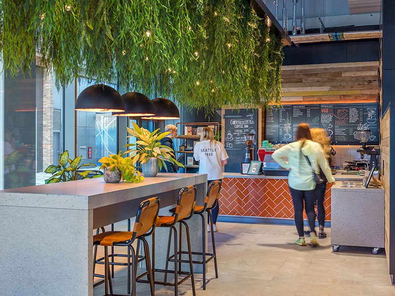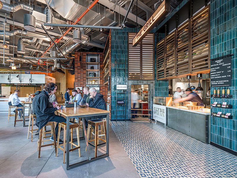 A variety of zones distributed across all three buildings encourage staff interaction and creativity. In addition to general workspace collaboration zones, each building contains a unique large scale space tailored to presentation, leisure, and entertainment activities. Further staff interaction is encouraged by placing a bespoke Home Kitchen on each floorplate. Staff health and wellbeing is further addressed with the provision of a gym overlooking the Clyde, hair and beauty suite, and quiet contemplation rooms. There are a number of restaurants and cafes are distributed across all three buildings, offering a diverse range of food & beverages in partnership with local vendors to encourage small business growth.