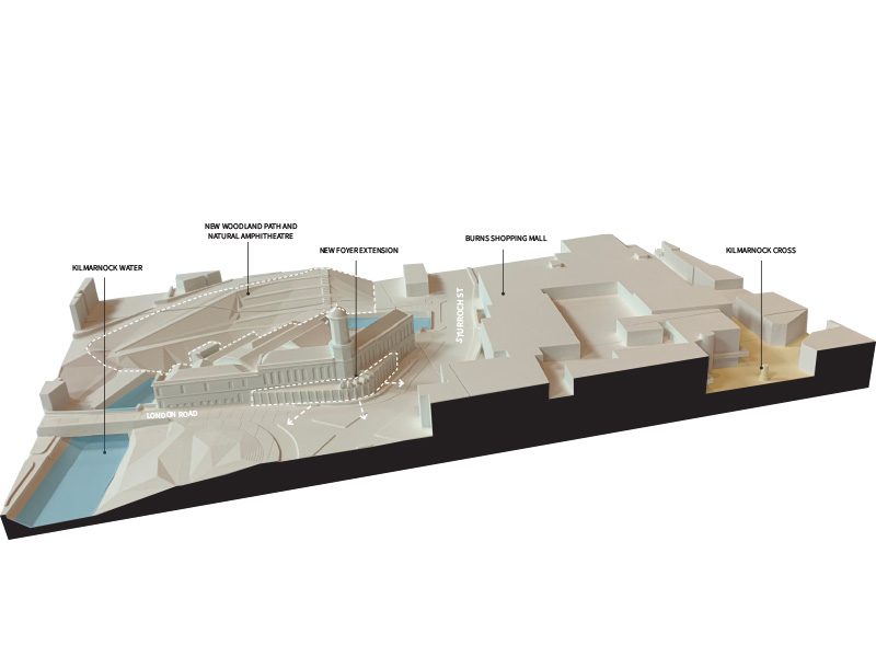 The architectural masterplan vision and concept design for The Palace Theatre & Grand Hall form part of EAC and EAL proposals to invest in the ‘Cultural Kilmarnock’ project, the proposals comprise; the development of a new cultural park for the town which includes the sensitive refurbishment and extension for The Palace Theatre and Grand Hall – as an initial phase and catalyst for wider improvements, the creation of new public realm and active travel and wayfinding links within the cultural park, and improved connections to Kilmarnock Water (to the rear of the Palace Theatre) and to Kilmarnock town centre.