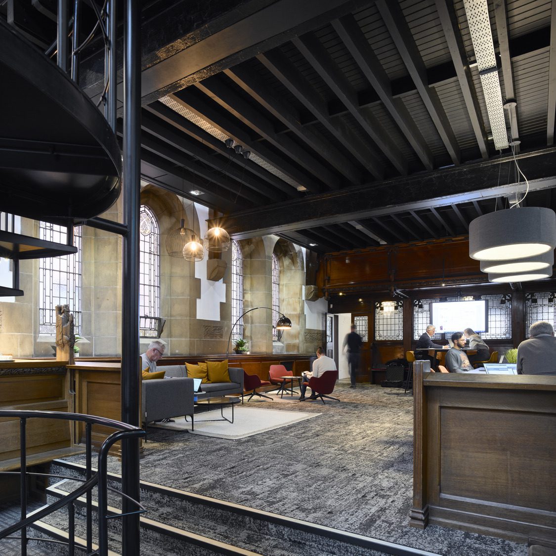 The interior design scheme carefully preserves and reinterprets the building’s original architectural features, integrating new elements that complement and enhance its historic character. Key features such as the Arts and Crafts-style roof timbers, Blaxter stone walls, and tall nave windows, remain central to the spatial experience. These are sensitively paired with modern interventions, including acoustic lighting and ergonomic furniture, to create a space that feels both grounded in its past and responsive to present-day needs. Original timber pews have been retained and reimagined as part of the interior language, sitting comfortably alongside contemporary seating and work settings. This layering of old and new creates a rich, textural environment that supports a variety of uses throughout the day.