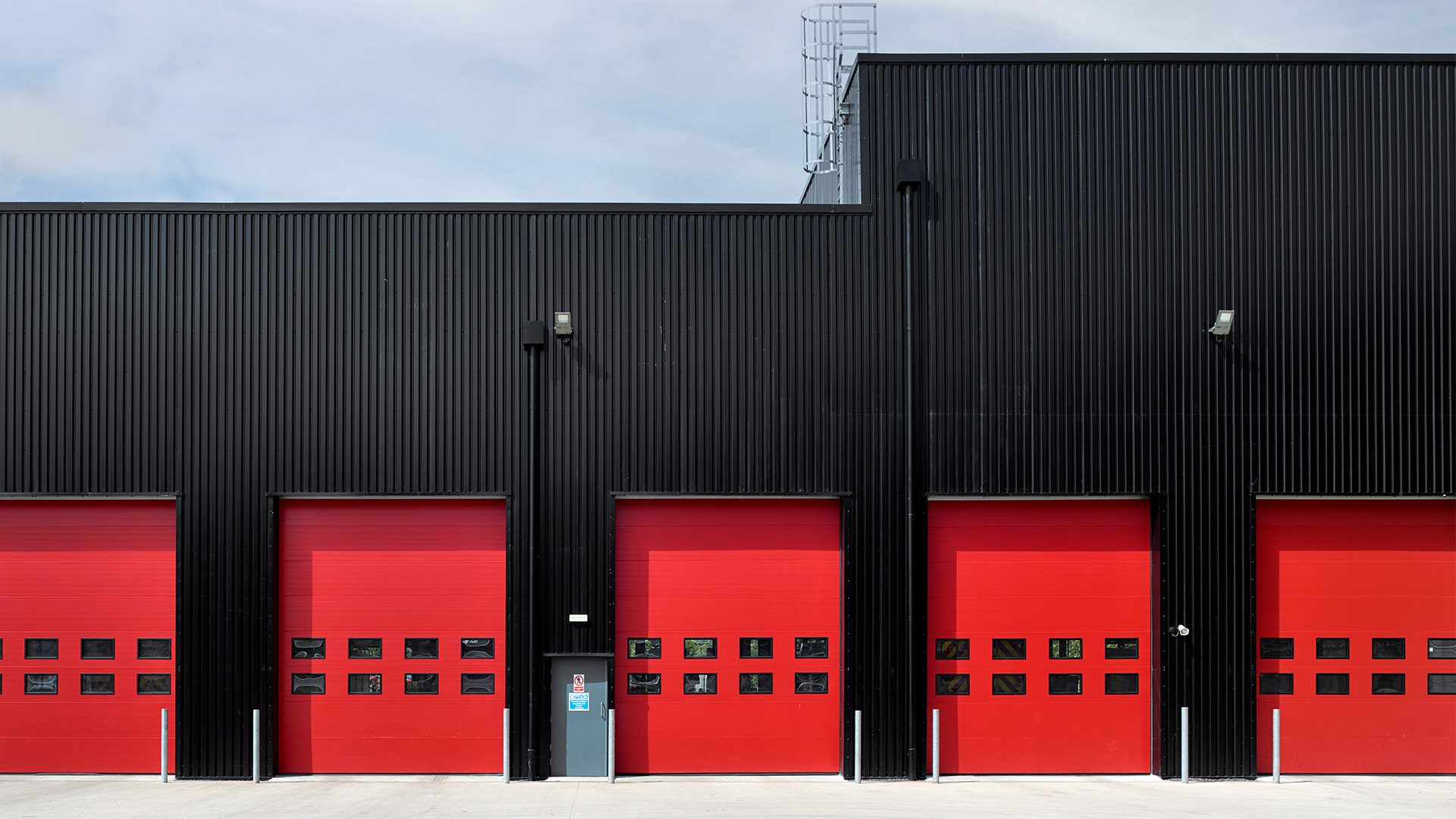 The appearance of the facility is that of a large shed, befitting its use as a predominately industrial building. A simple palette of external materials is used – corrugated black wall cladding with dark grey flashings, window frames and personnel doors, supplemented by a standing seam roof. A parapet around the roof keeps the 4 degree pitch hidden from view and maintains the simple massing and rectilinear proportions of the building externally. The vehicle doors, coloured red, are provided to every vehicle bay, which, along with a one-way traffic management system, enables day-to-day operations to run as smoothly as possible. The colour and style of these doors immediately makes apparent the building’s use as a facility for the fire service – an important consideration from early on in the design process.