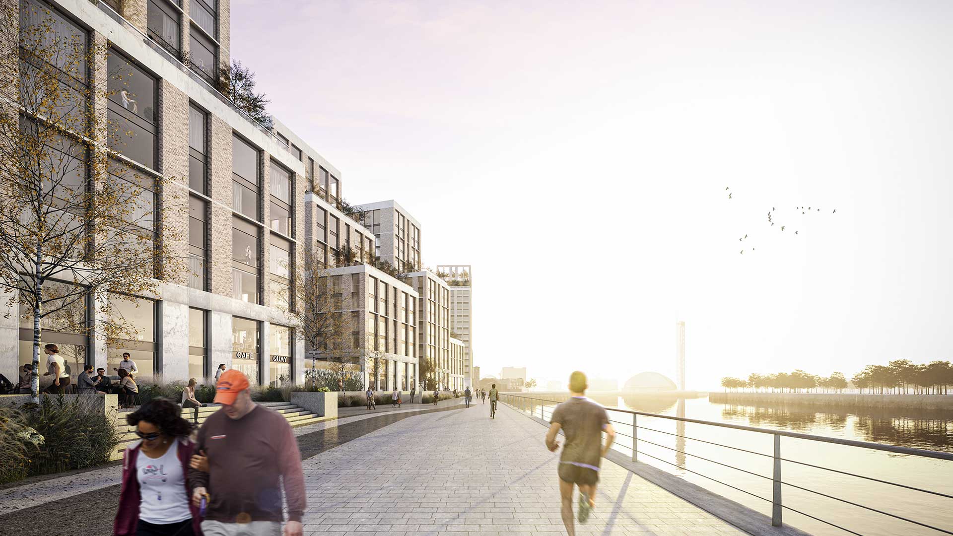 A continuous river walkway linking east to west is reinstated to improve pedestrian and cycle connectivity along this key route, which will further enhance and support the mix of uses that encourage lively public areas and riverside activity throughout different times of day and night.